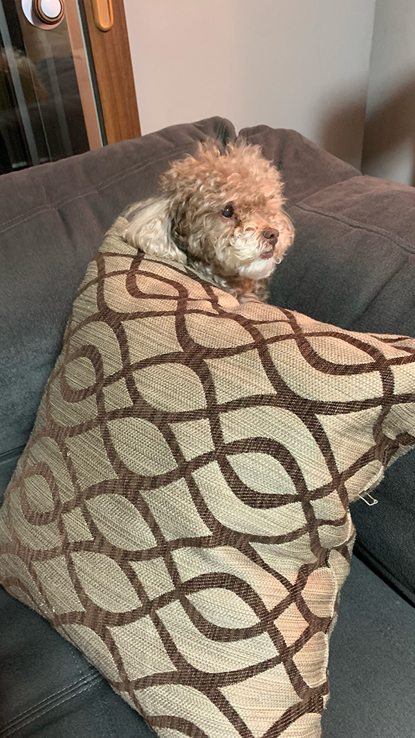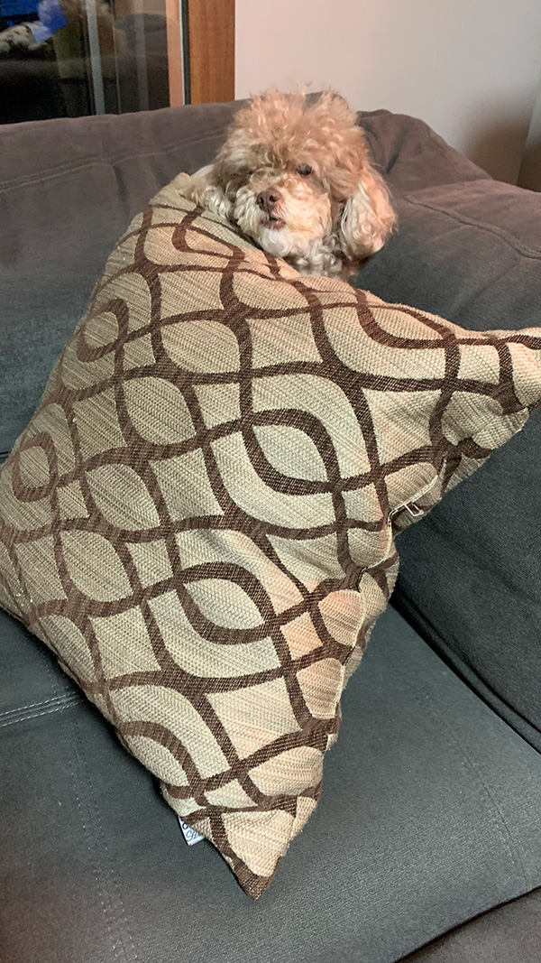 쿠션뒤에서 역시나 부스스한 머리를 내립니다.