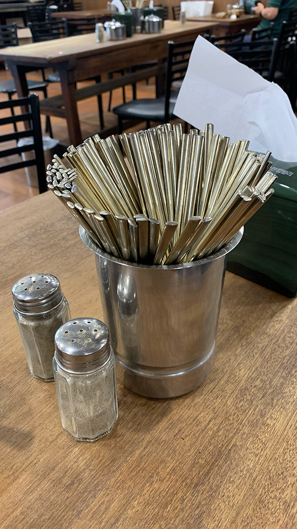 테이블에는 묵직한 쇠젓가락이 담긴 통과 후추통, 냅킨이 있었습니다.