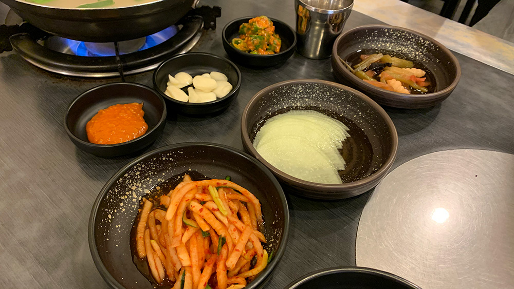 족발과 함께 차려주시는 반찬과 쌈장, 마늘입니다.