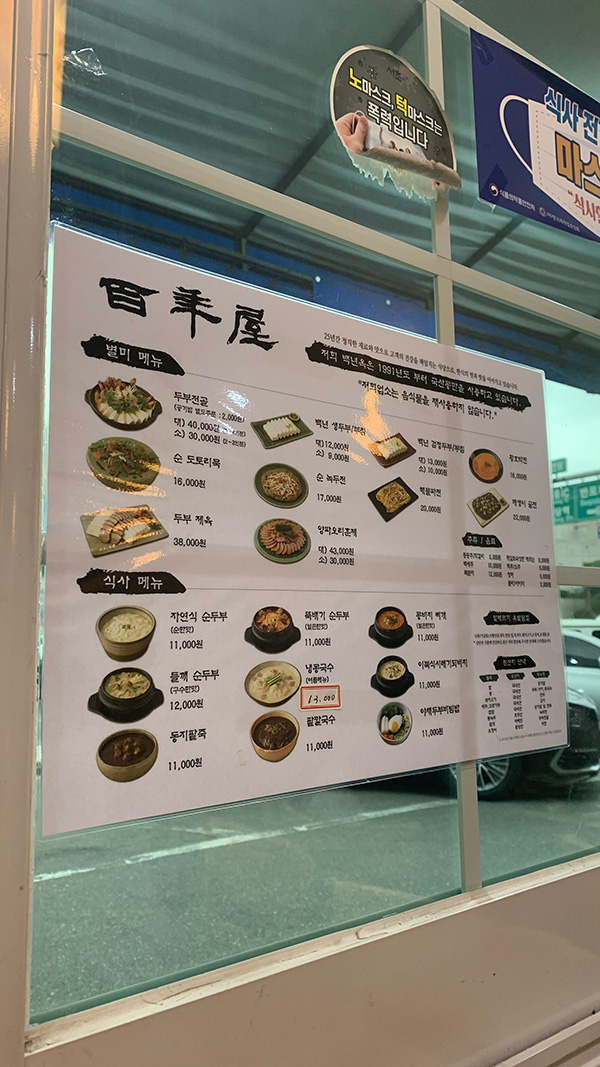 순두부는 집에서 만들어 먹을 정도로 아주 좋아해서 자주 먹는데 마침 오래된 두부전문점이 가까이에 있다며 계획에도 없던 저녁을 먹게 되었습니다. 많은 분들이 아시는 바로 그곳, 30년 된 두부전문점 백년옥입니다.