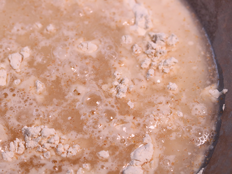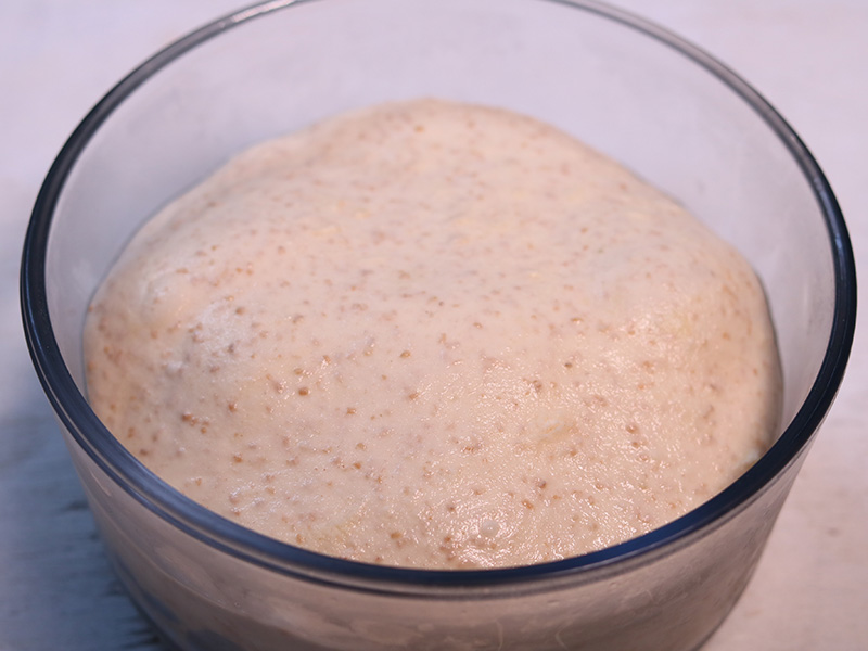 3. 통밀가루나 표백을 하지 않은 밀가루는 단백질 함량이 높아 수분을 더 넣어줘야 하는데 비가 많이 오는 관계로 습기가 많아 물 1컵에서 2스푼을 빼고 했어요. 여름이나 기온이 높은 지역 일 경우 냉장고에서 24시간 발효하시면 됩니다.