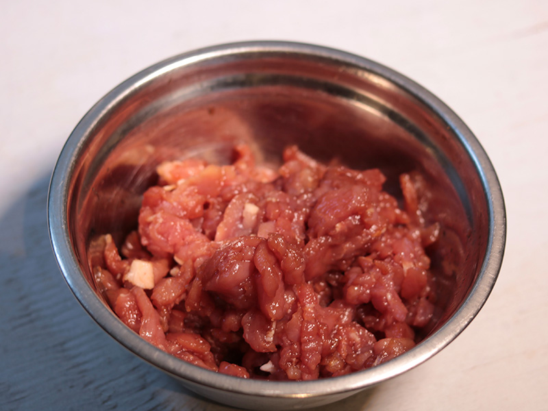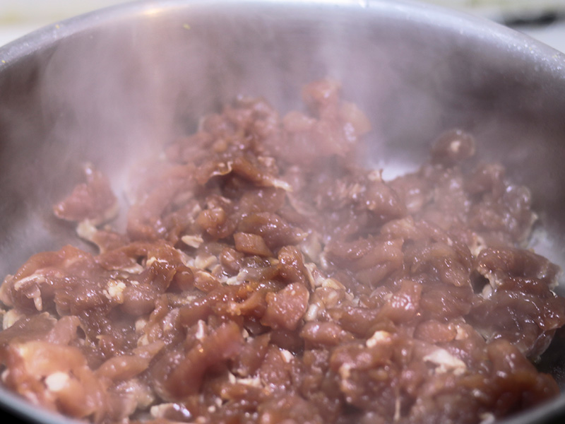 1. 기름이 적은 부위인 돼지고기 등심 300그램을 가늘게 채 썰어 간장 1T, 설탕 1T에 30분간 재워주세요. 다른 돼지고기 부위를 사용하셔도 됩니다.