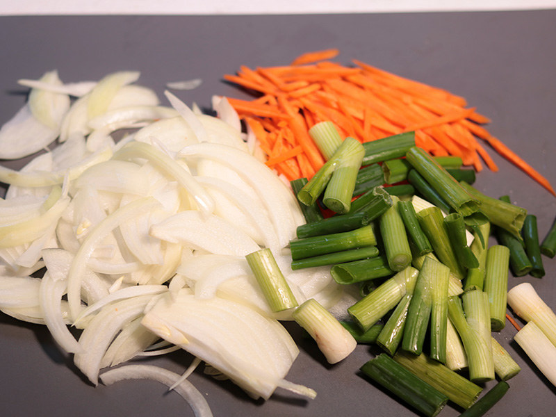 2. 양파 1개, 당근 1개는 채썰고 파는 큼지막하게 썰어줍니다. 파 대신 대파 사용해도 좋아요. 피망이나 어묵을 넣어도 맛있겠지요.