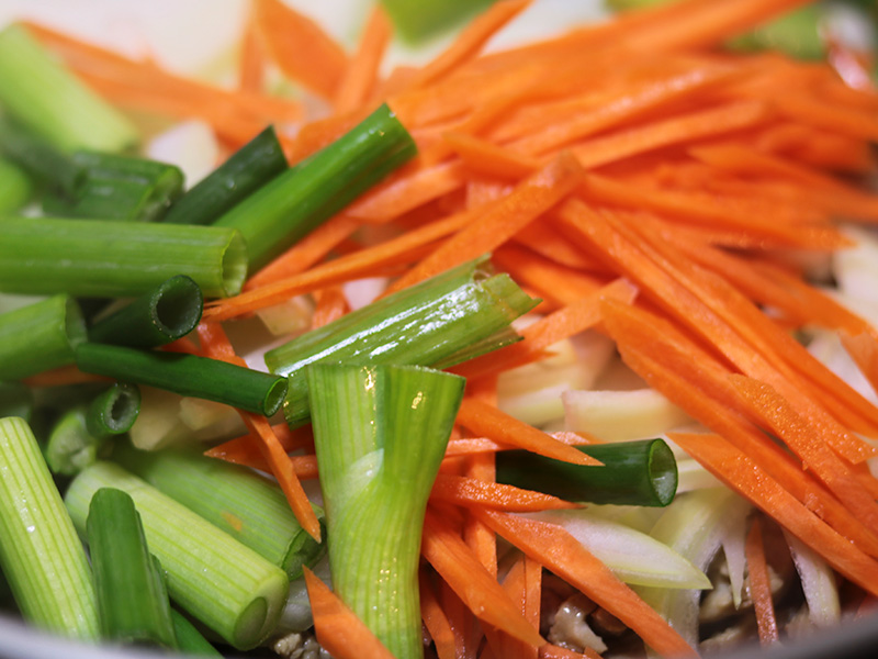 7. 돼지고기가 반쯤 익으면 잡채 양념 2스푼과 파, 당근, 양파를 넣고 같이 볶아줍니다.