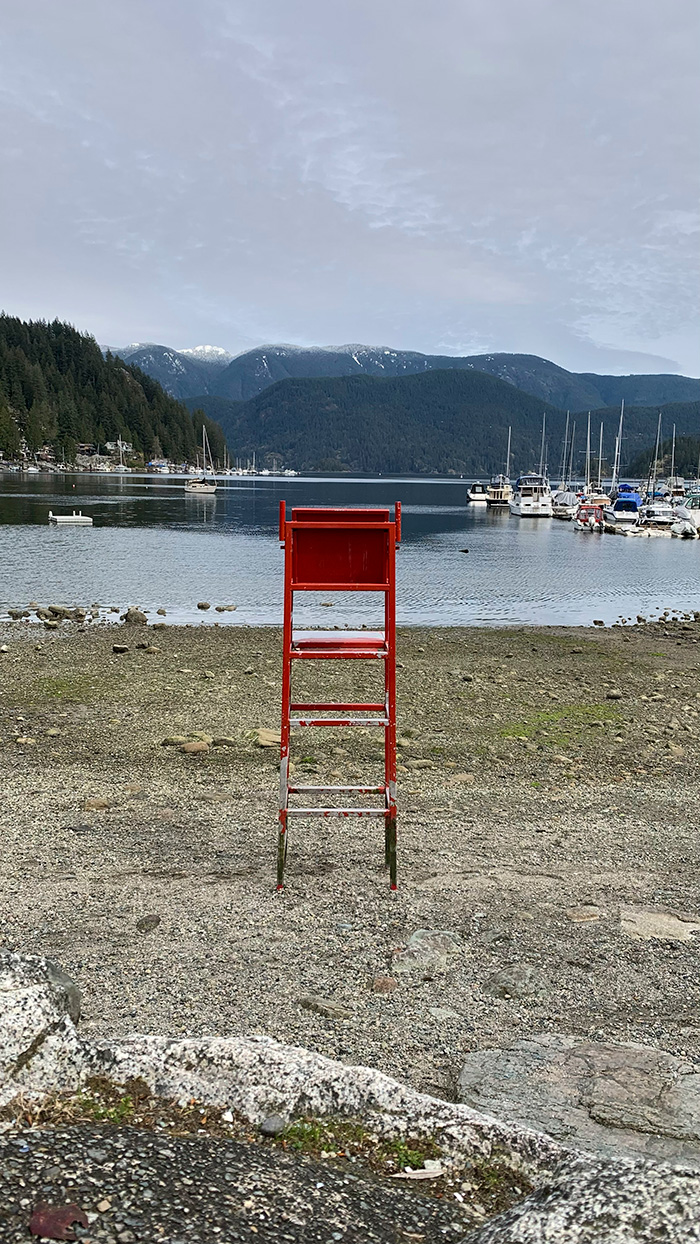 지켜보는 이 없는 빨간 안전 의자가 덩그러니 놓여있습니다.