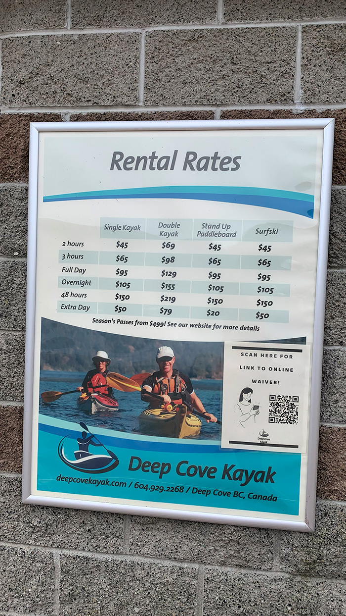 친절하게 가격표와 주의사항, 그리고 지도를 벽에 걸어놓았습니다. 싱글 카약을 렌털 할 경우 하루 $100 정도 하네요. 주말이나 장기 렌털 시에는 예약을 꼭 미리 하고 가시면 좋을 듯합니다.