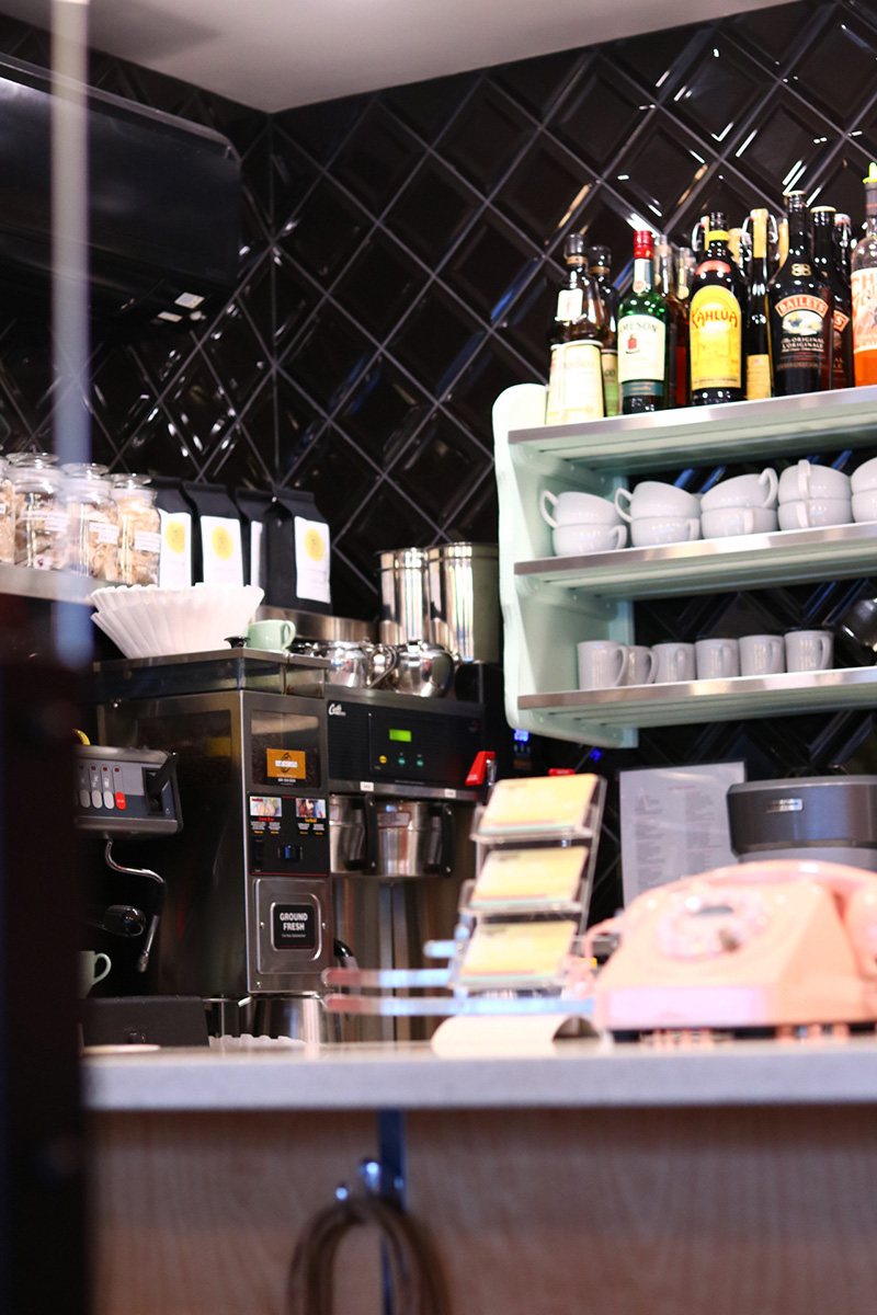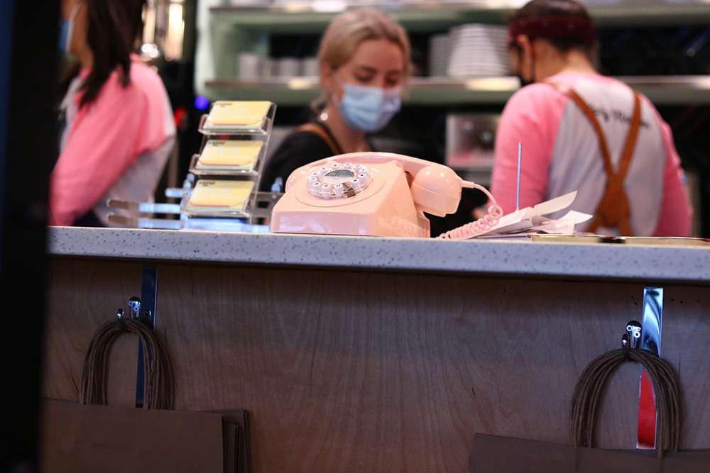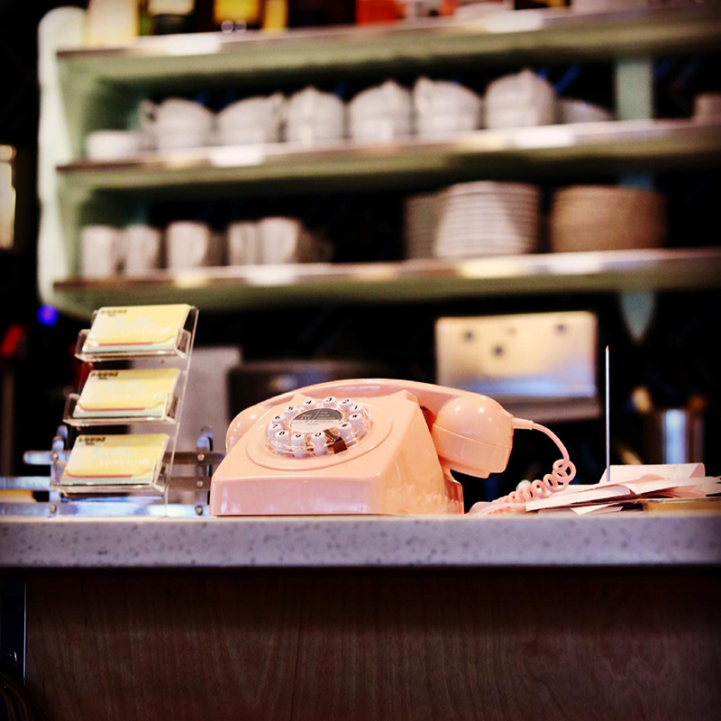 커피가 올려져 있는 하늘색 선반과 이제는 보기 드문 핑크색 다이얼 전화기, 그리고 노란색 명함까지 소품 하나까지 신경을 많이 쓴 듯 보입니다.