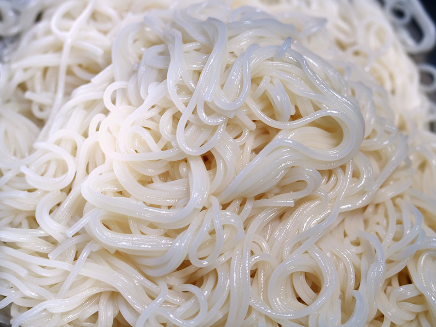 찰랑찰랑 물에 헹군 물기 머금은 쫄깃한 소면입니다.