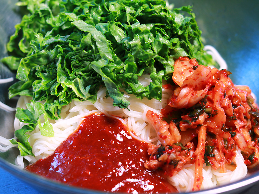 재료 : 소면 200그램, 상추, 신김치, 오이, 고추장 3T , 설탕 2T , 참기름 3T , 마늘 1T