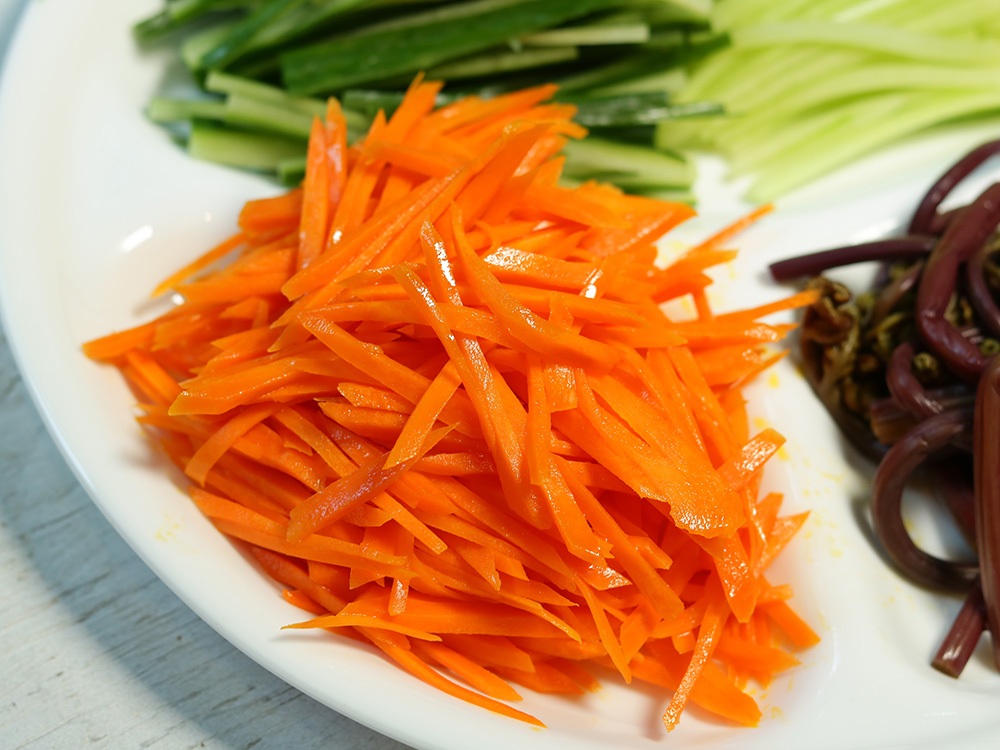 2. 채썬 당근은 기름 두른 팬에 소금 조금 넣고 볶았습니다. 기름에 볶으면 맛도, 영양가도 더 많아집니다.