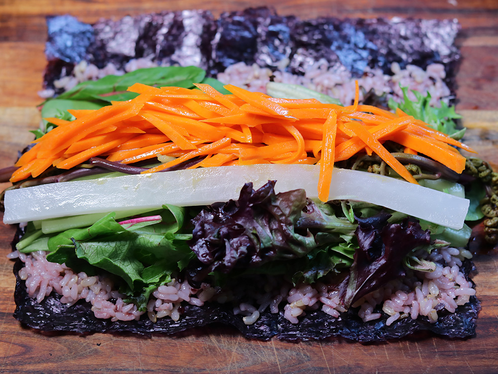 5. 샐러드, 단무지, 고사리 장아찌, 오이, 당근을 밥위에 올려놓습니다.