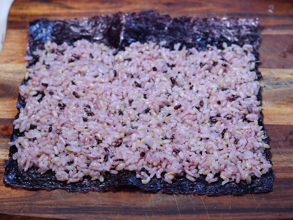 4. 도마에 김을 놓고 손에 물을 묻힌 후 김 앞부분을 1센티 넣고 남기고 밥이 으깨지지 않게 잘 펴줍니다.