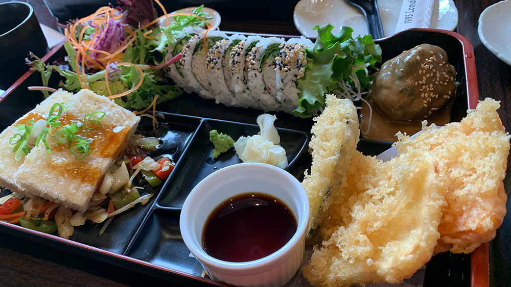 그린 샐러드, 야채롤, 모둠 야채 튀김, 두부 튀김과 야채 볶음, 시금치 고마에로 구성되어 있습니다.