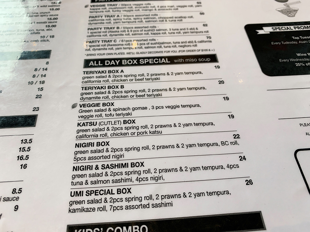 열심히 메뉴 공부를 하다가 발견한 All day box special이 눈에 들어옵니다.