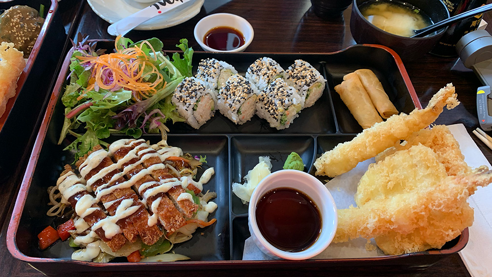 그린 샐러드, 캘리포니아롤, 새우 야채 모둠 튀김, 미니 스프링롤, 돈카츠와 야채 볶음이 함께 나왔습니다.