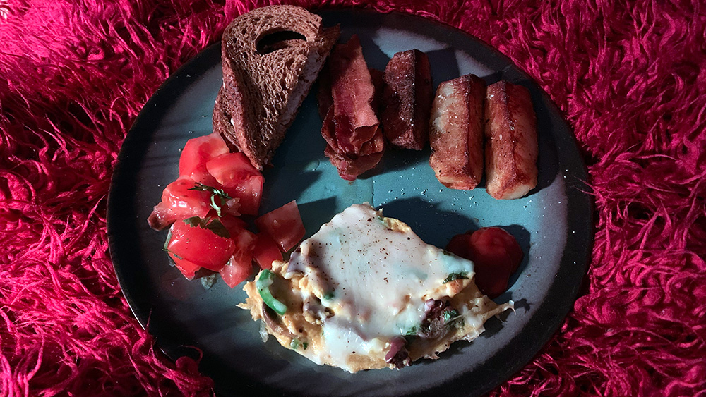 치즈 야채 스크램블과 올리브오일 토마토 샐러드, 팬에 구운 감자, 크리스피 베이컨, 그리고 호밀빵으로 푸짐하게 먹으면 하루가 든든합니다.