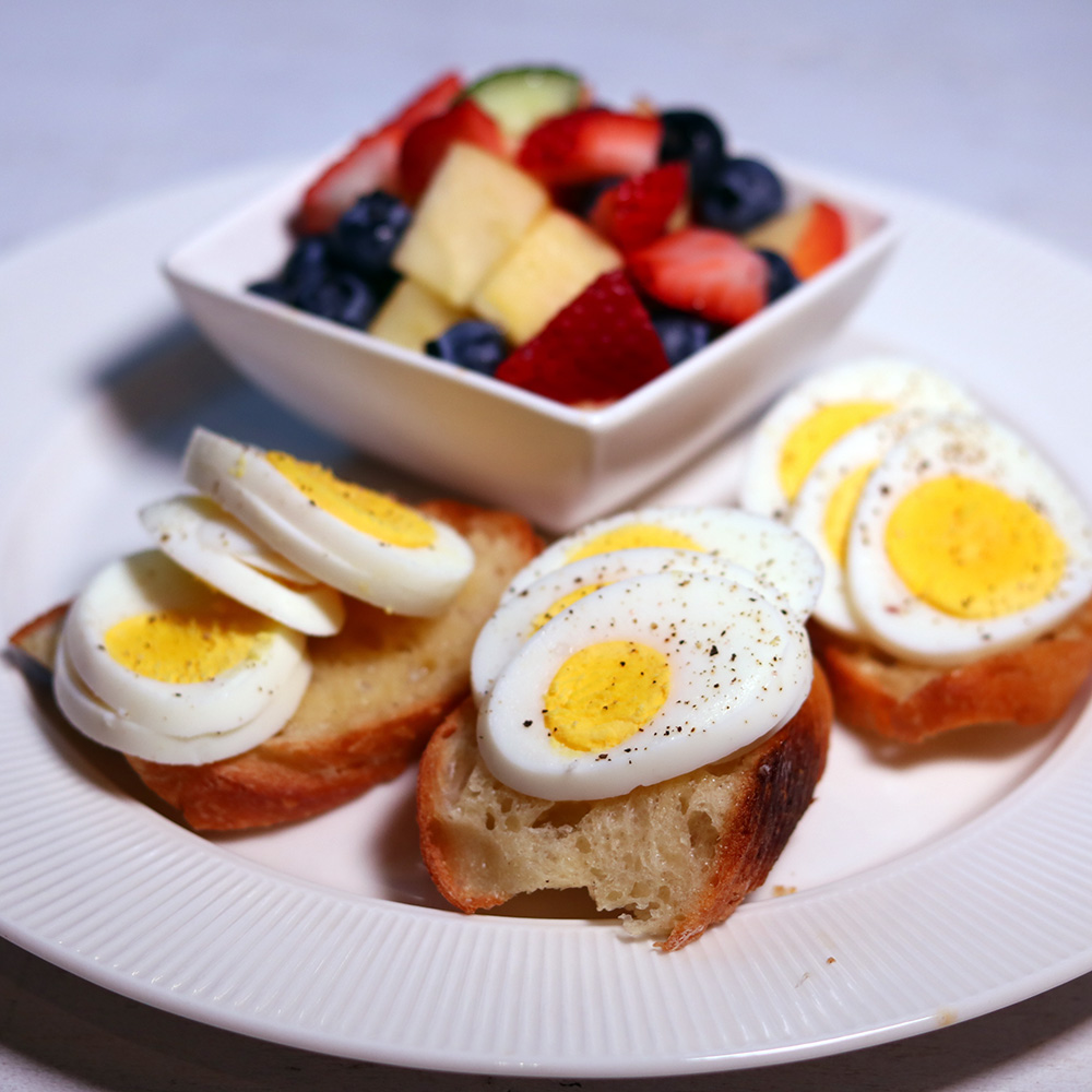 아침에는 주로 간편하게 오트밀을 먹는데 가끔은 24시간 발효한 반죽으로 구운 아티잔 브래드와 삶은 달걀, 그리고 과일 샐러드를 곁들여 먹습니다. 바쁜 평일보다는 시간적인 여유가 많은 주말 아침에 느지막이 일어나자마자 달걀을 삶고 과일도 자르고 빵은 전날 미리 구워 놓은 것을 사용합니다.