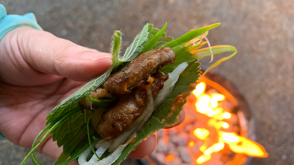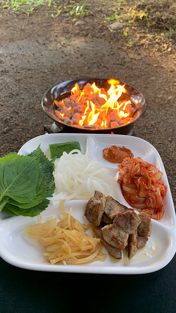 잘 구워진 고기들과 쌈장, 깻잎, 양파절임, 새콤달콤 무생채, 그리고 김치를 접시에 골고루 담았습니다. 가스 캠프화이어 앞에서 먹어야죠.
